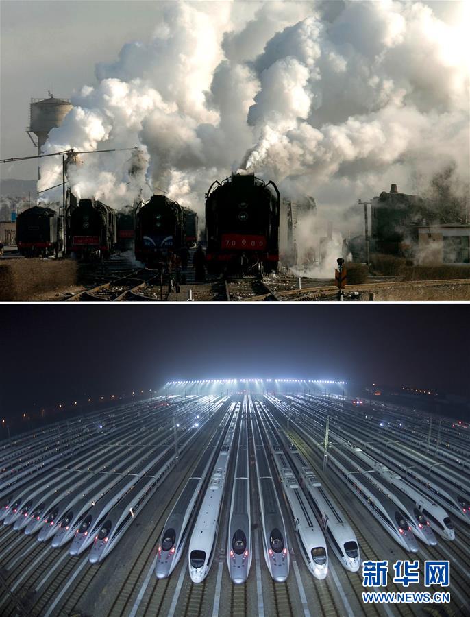 这是一张拼版照片,上图:2005年12月7日,最后一批“前进”型蒸汽机车在内蒙古集通铁路大板机务段整装待发(新华社记者张领摄);下图:2019年1月20日,动车组列车停靠在武汉动车段的存车线上,准备进行检修和保温作业(新华社记者熊琦摄)。