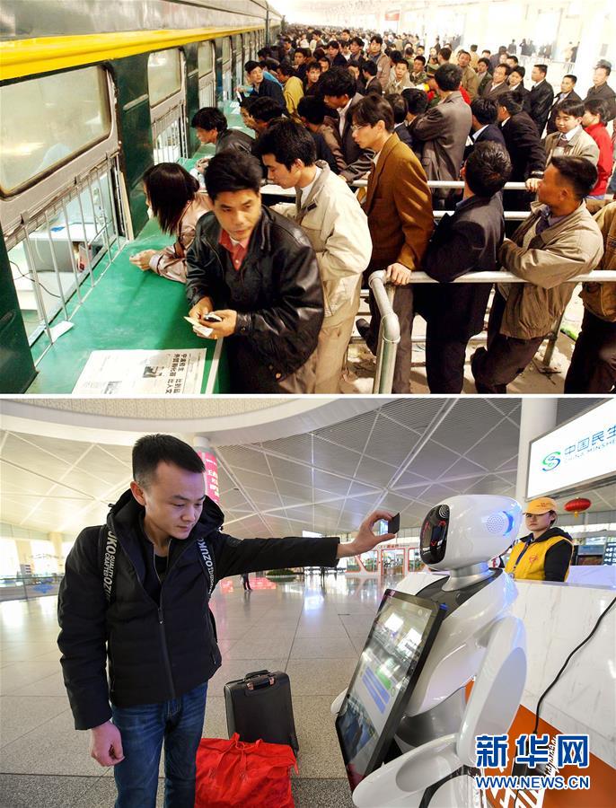 这是一张拼版照片,上图:2003年1月20日,旅客们在位于广州市黄沙大道的一家仓库中的临时售票处购买车票(新华社记者周文杰摄);下图:2019年1月22日,在呼和浩特火车东站,旅客将车票放在智能机器人面前扫码获取乘车信息(新华社记者彭源摄)。 新华社发