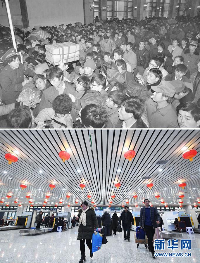 这是一张拼版照片,上图:1993年春运期间,旅客在北京火车站排队进站(新华社记者唐召明摄);下图: 2019年1月20日,旅客在改造后的兰州火车站进站乘车(新华社记者陈斌摄)。 新华社发