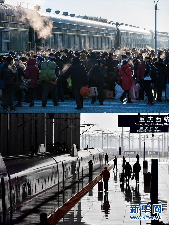 这是一张拼版照片,上图:2016年1月31日,在内蒙古呼伦贝尔根河火车站,当地群众乘车回家(新华社记者连振摄);下图:2018年2月12日,重庆西站的站台上,一列动车组准备发车(新华社记者刘潺摄)。 新华社发
