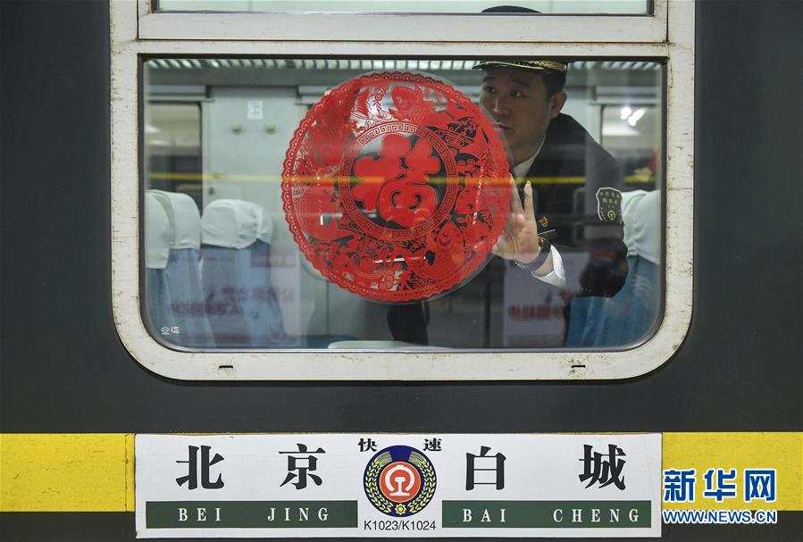1月28日,在K1024次列车发车前,李长明将“福”字张贴在列车车窗上。新华社记者 许畅 摄