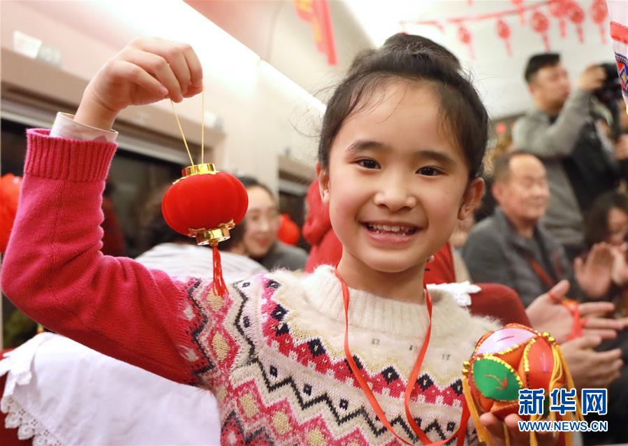 2月1日,小朋友在G529次列车上展示领到的纪念品。