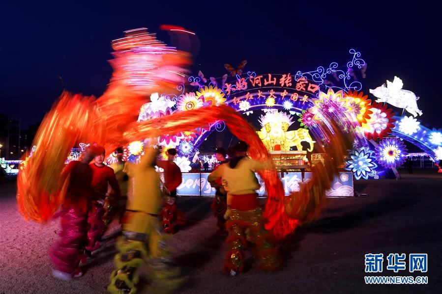 2月2日,社火队在张家口新春灯会上表演舞龙。 当日,2019张家口新春灯会在河北张家口市经济开发区老鸦庄镇亮灯,百余个大型灯组璀璨夺目。 新华社发(武殿森 摄)