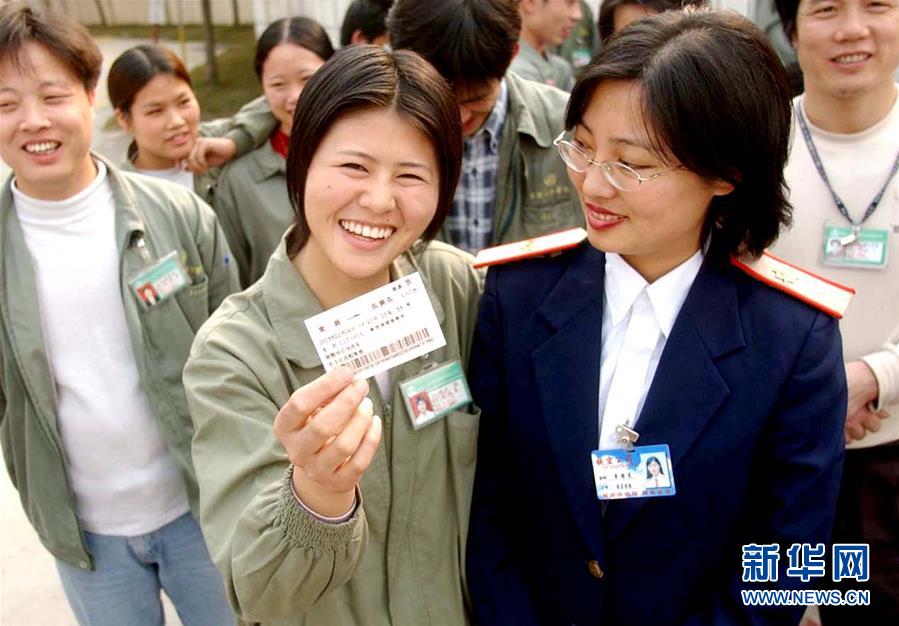在广东省东莞市三和塑胶制品有限公司打工的江西省上饶市女青年张云英(前左)开心地拿到了南昌铁路局春运服务小组送来的节后返程票(2003年1月22日摄)。 新华社记者陈春园摄