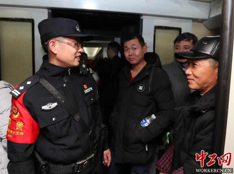 2月2日,乘警长王宏勋在汉口至连云港东K1624次列车上和旅客交流。