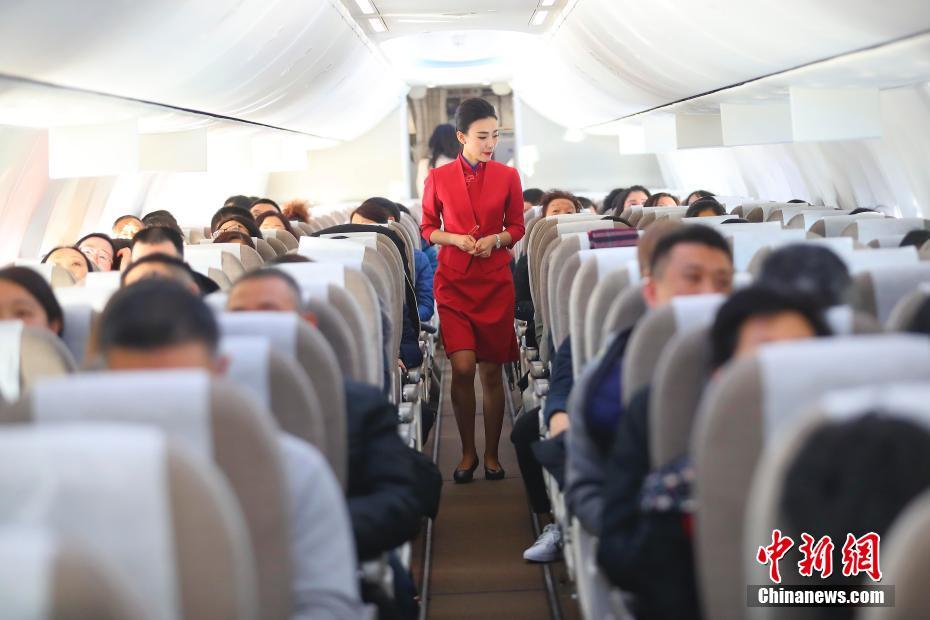 2月4日,在太原飞往上海的MU2408航班上,空乘人员正在飞机上巡视。当日正值农历大年三十也是春节假期第一天,大批民众踏上出行旅途。东航山西分公司特别在除夕至大年初二(2月4日至2月6日)的航班上增加了饺子,让乘客在万米高空上也能体会到浓浓的年味。中新社记者 张云 摄