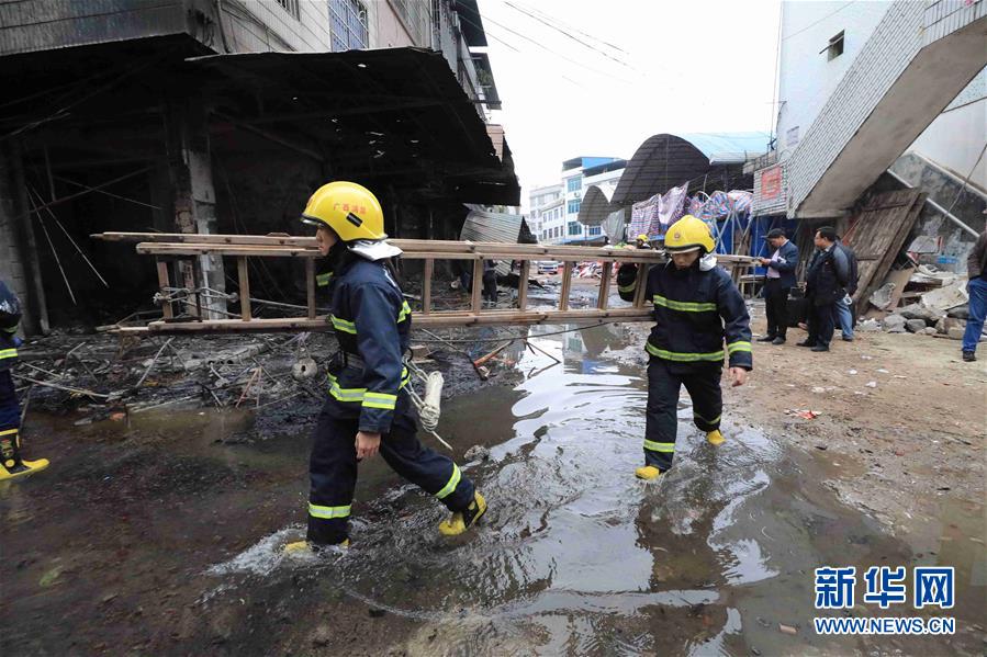 2月5日,在融安县大良镇,消防人员在火灾现场清理物品。