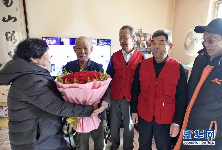 2月5日,东高地街道党员为老服务探访团成员为老党员马学信(左二)送上鲜花。 新华社记者 李欣 摄