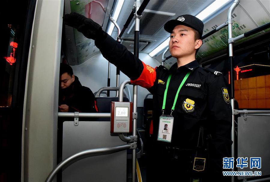 2月4日晚,1路公交车乘务管理员杨永成在公交车出站前确认车门是否已关闭。 除夕之夜,北京市公交集团第四客运分公司1路公交车员工坚守岗位,为广大乘客服务。 新华社发(任超 摄)