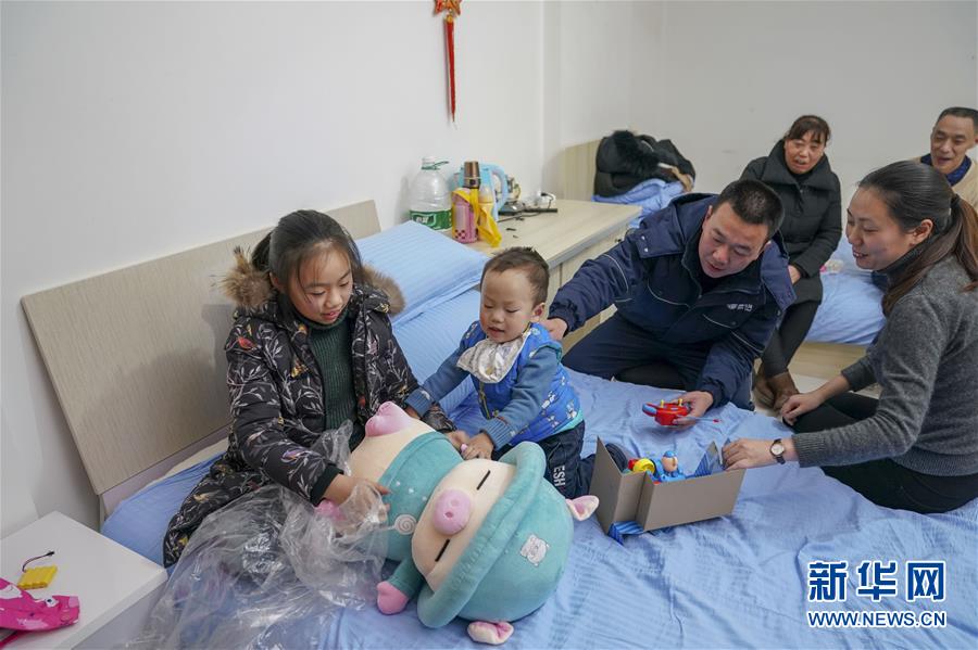 2月4日,在周一兵的宿舍内,女儿周楠雅(左一)和儿子周云乙(左二)拆开周一兵给他们准备的新年礼物。 新华社记者 刘潺 摄