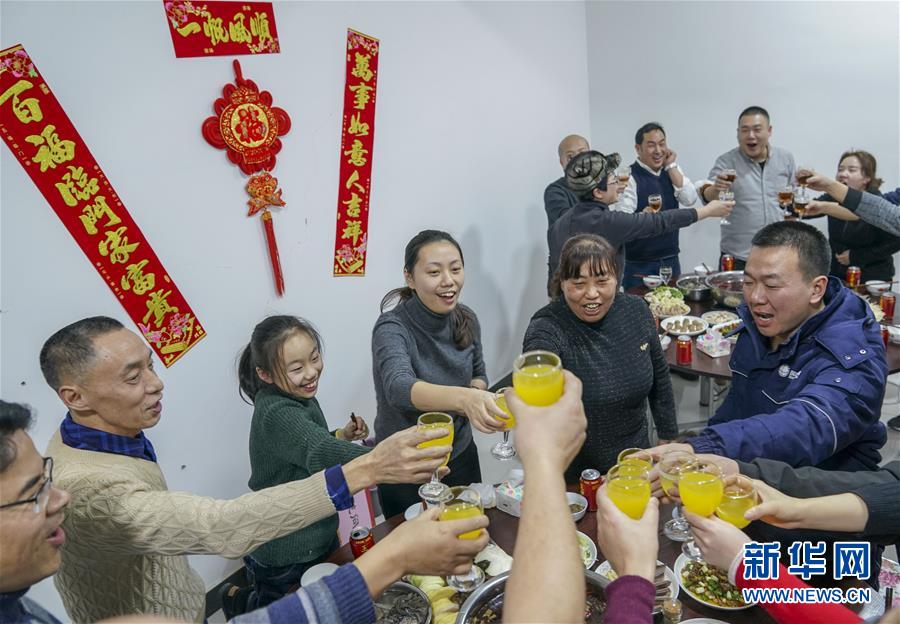 2月4日晚,周一兵的同事和周一兵(前右一)一家人吃团圆饭。新华社记者 刘潺 摄