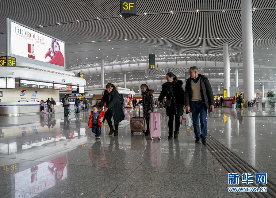 2月3日,在重庆江北国际机场航站楼内,岳玲玲(右二)和家人准备乘坐飞机前往甘肃兰州。 新华社记者 刘潺 摄