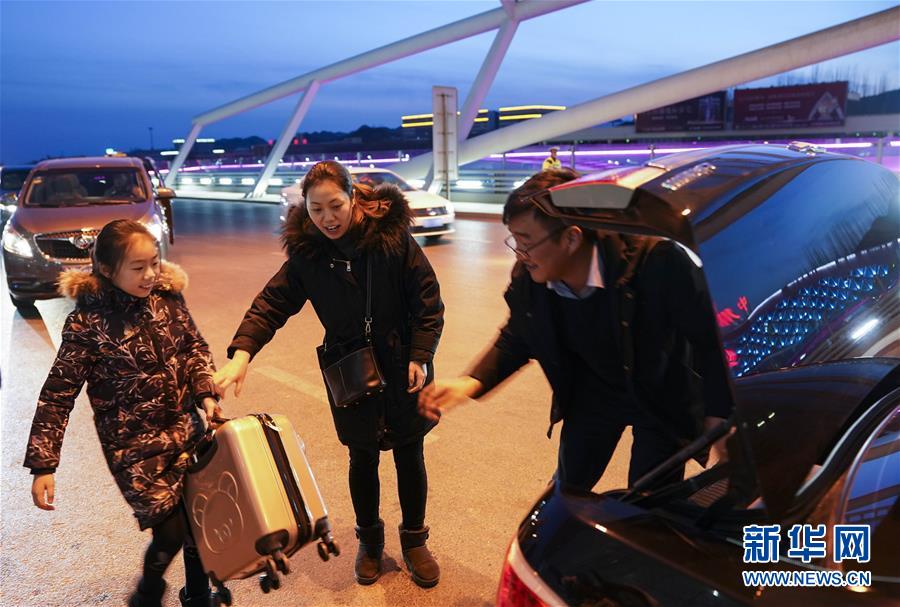 2月3日晚,在兰州中川机场候机楼,岳玲玲(中)和家人将行李放进网约车的后备箱。 新华社记者 刘潺 摄