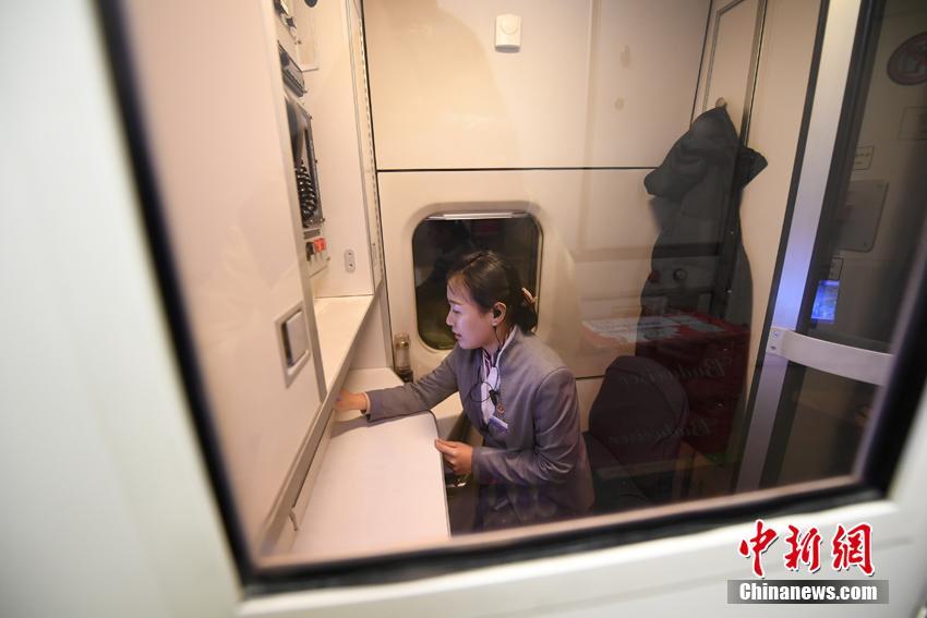 “动嫂乘务组”的乘务员在做车厢广播。乘务员说,她们几乎每个人都成为了妈妈,平时工作忙碌,对家人的陪伴十分少。但是能服务好每一名旅客她们就十分开心。张瑶 摄