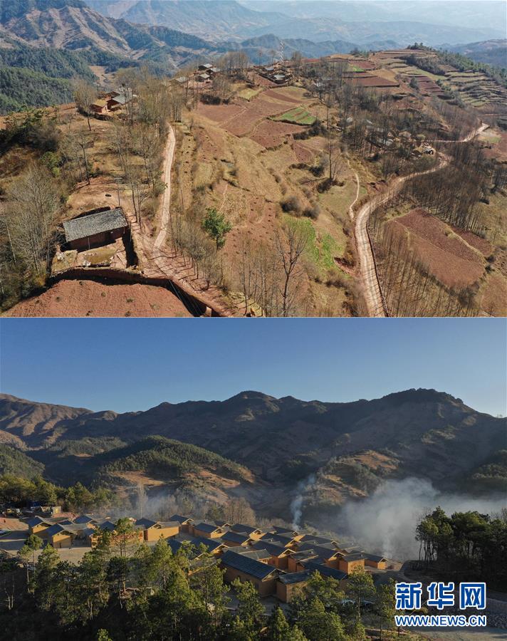拼版照片:上图是2月11日无人机拍摄的昭觉县三河村原来的土坯房;下图是2月11日无人机拍摄的三河村易地扶贫安置点。