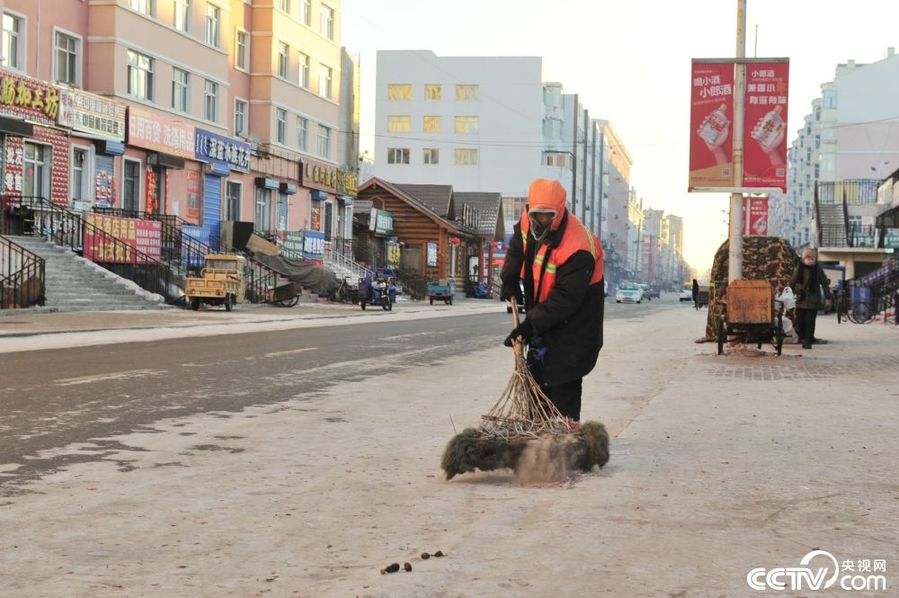 简单的早饭后,王文章先在厚厚的毛衣外裹上一件棉袄,再套上厚重的工作服,最后用帽子和口罩把头面部包得严严实实。房门一开,寒风裹挟着白色雾气扑面而来,王文章推着自行车出了门。一路上,已经“胖了”一圈的王文章透过口罩呼出大口的热气,有点儿吃力地骑车前往位于市区爱民西街的责任路段。