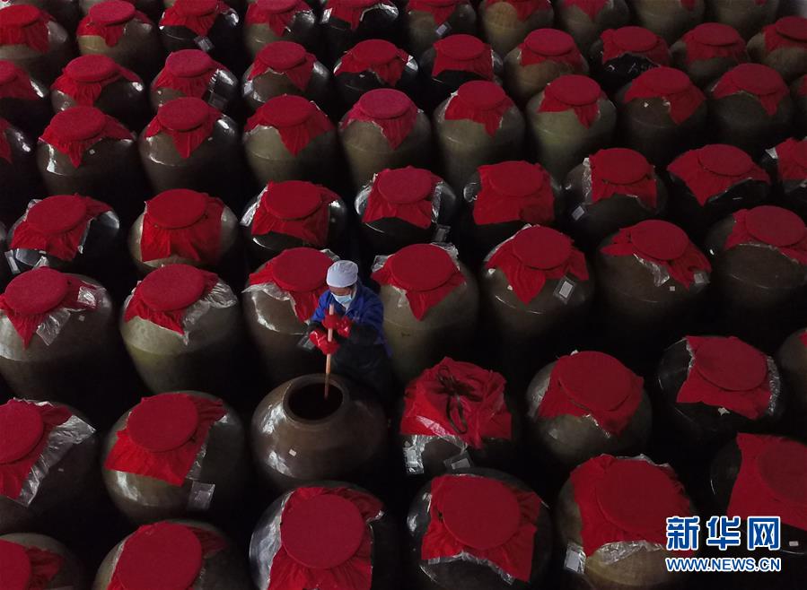 2月13日,在麻江县一家红酸汤生产企业,工人在搅拌发酵中的红酸汤(无人机拍摄)。 红酸汤是贵州省黔东南苗族侗族自治州群众喜爱的一种传统食品,其制作工艺历史悠久,以鲜辣椒、西红柿和生姜为主原料,经过清洗、入坛、发酵等多道工序制作而成。近年来,当地政府大力推动红酸汤传统工艺保护、传承和创新,红酸汤的生产向规模化、现代化、标准化方向发展,并积极向外拓展市场,产品受到消费者青睐。 新华社发(蔡兴文 摄)