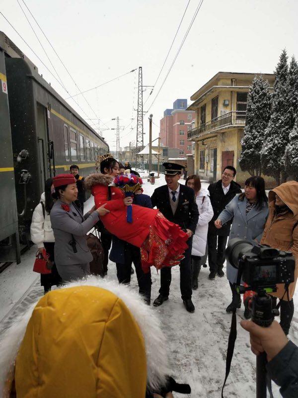 一对新人为啥选择在慢火车上举办婚礼呢?原来,2月13日, 郑州局集团有限公司管内长治站普降大雪,高速公路结冰封闭。2月14日,是赵一凡和申芸芸的大婚,道路被大雪封山,新郎的迎亲车队无法从高平到长治接新娘,为了不耽误婚礼举行,一对新人临时改变线路,选择了火车,乘坐6797次慢车完成婚礼。在司仪和新郎的宾朋建议下,一场特殊的婚礼在小慢上临时举行,小慢车变身婚车。