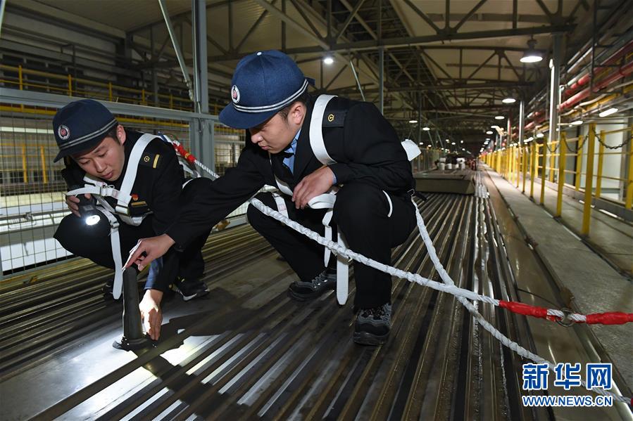 2月14日晚,福州电务段车载信号工在福州南动车所检查动车车顶无线天线。