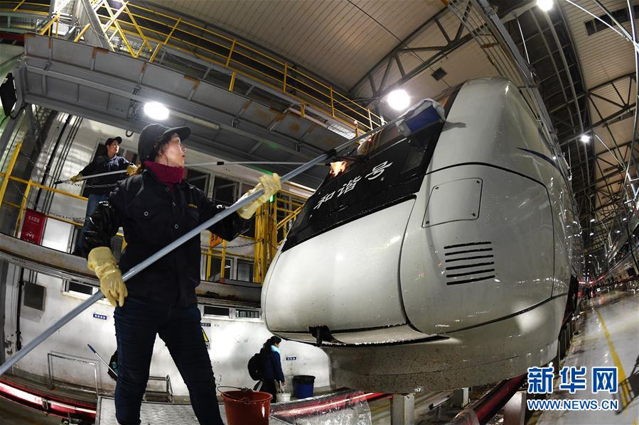 2月14日晚,工作人员在福州南动车所清洗动车。 新华社记者张国俊摄