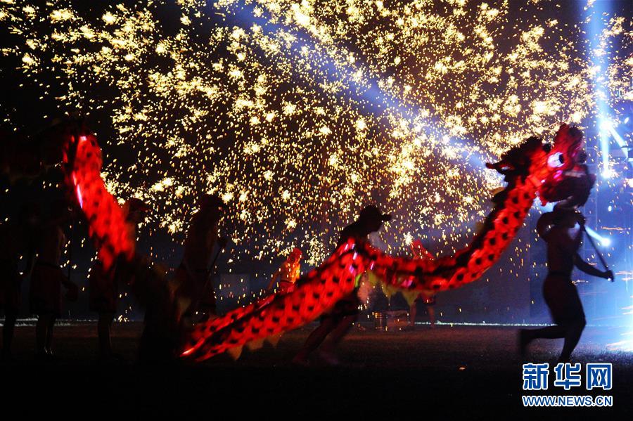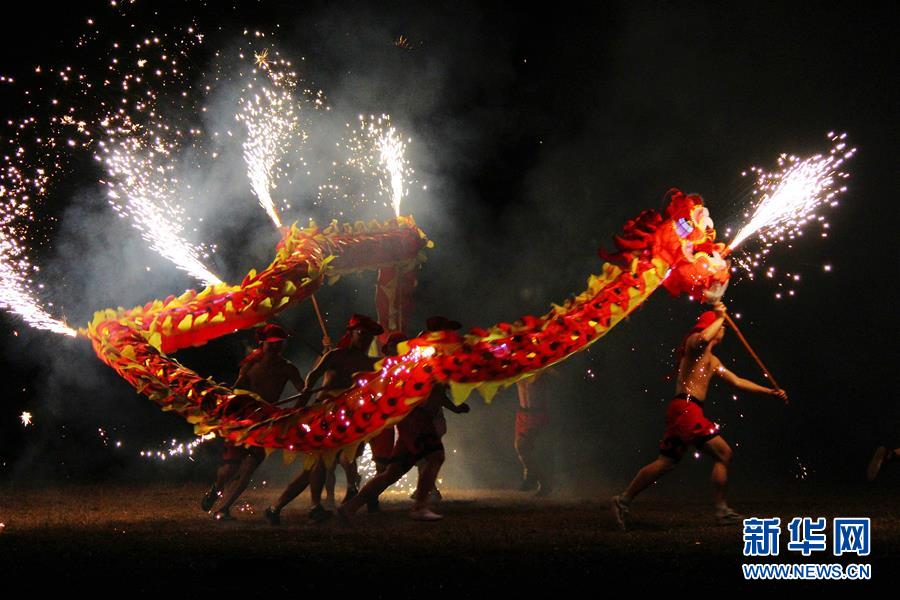 2月15日,在湖北省十堰市郧阳区首届民俗花灯文化艺术节上,民间艺人在“铁花”中舞龙。 新华社发(曹忠宏 摄)