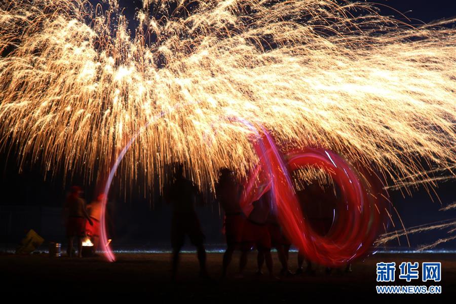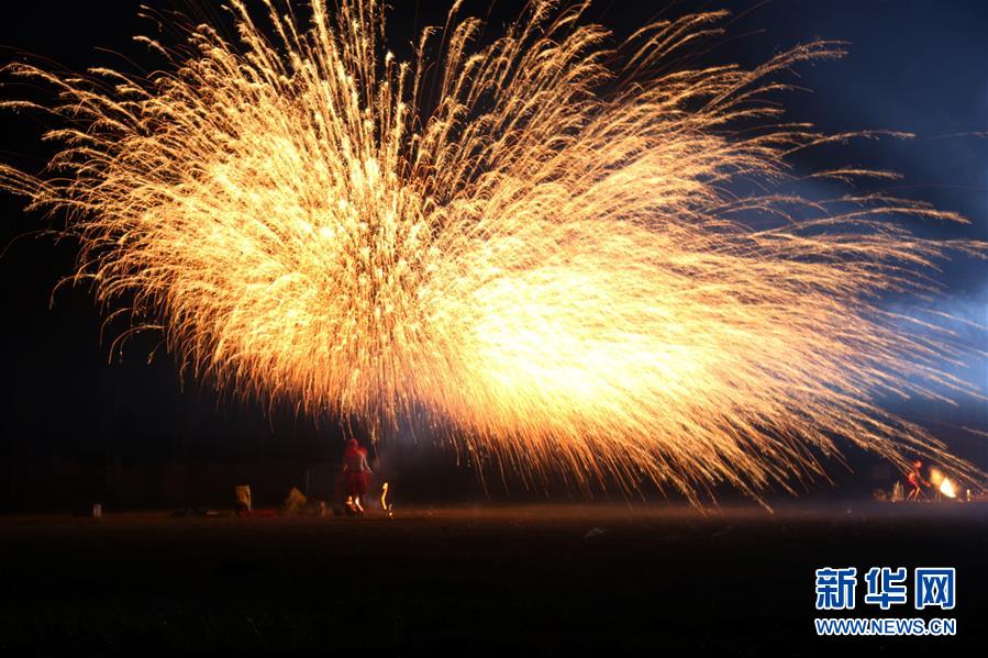2月15日,在湖北省十堰市郧阳区首届民俗花灯文化艺术节上,民间艺人在表演“打铁花”。 新华社发(曹忠宏 摄)