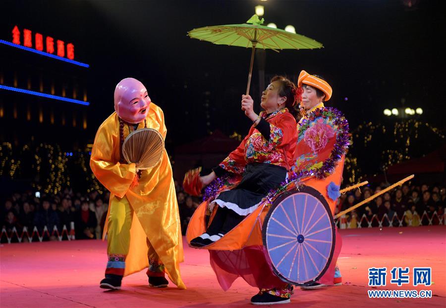 2月15日晚,湖北省宣恩县民间艺术团演员在县城人民广场上进行民俗表演。 新华社发(宋文 摄)