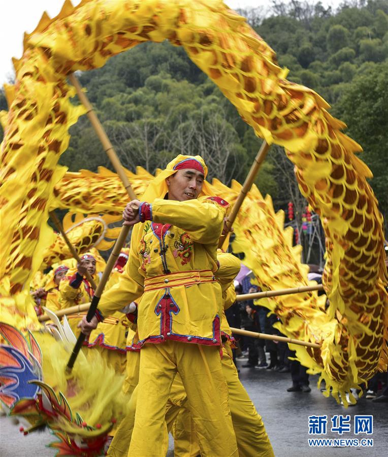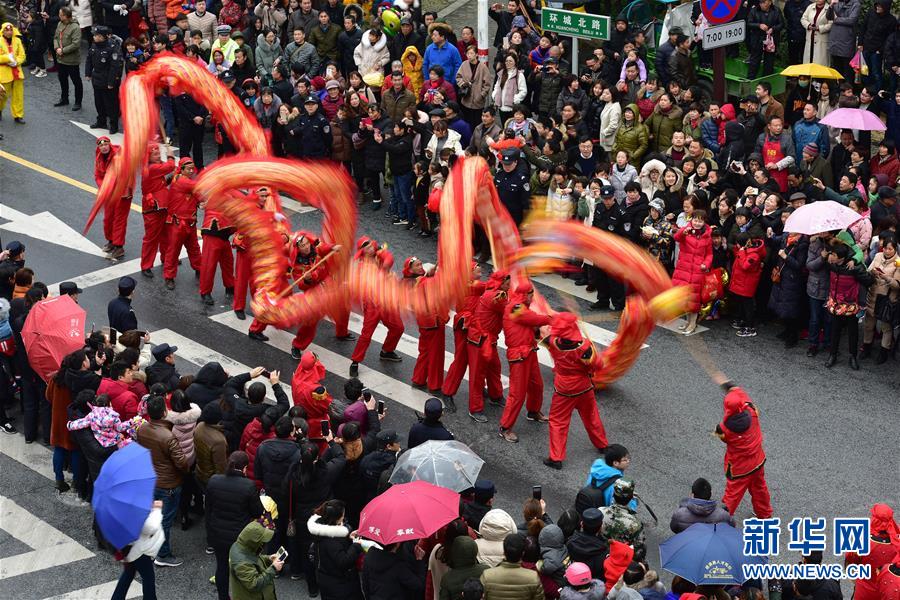2月17日,民间艺人在灯会活动现场表演舞龙。 当日,第十九届浙北乾龙灯会在浙江省德清县举办,当地的舞龙队踩街巡游,热热闹闹迎接元宵佳节。浙北乾龙灯会是德清县的一项重大节庆活动,也是浙江省级非物质文化遗产。 新华社发(徐晖 摄)