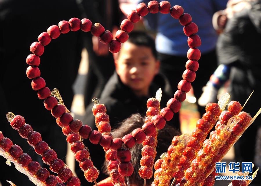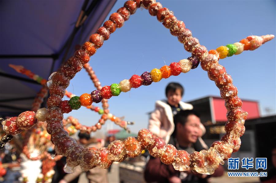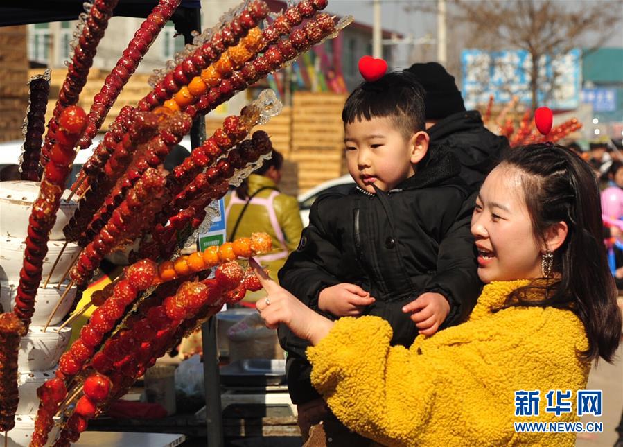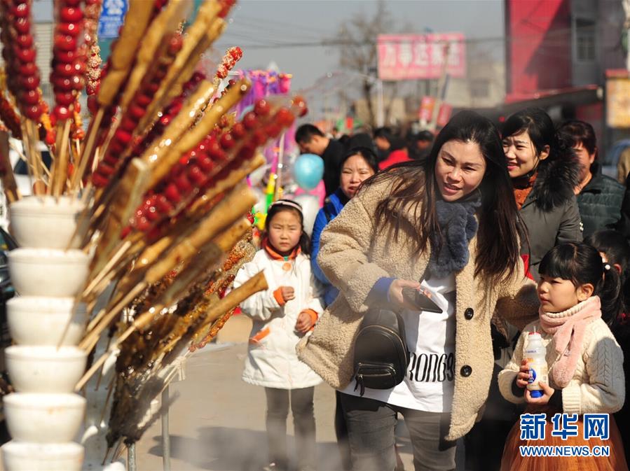 2月17日,游客在后李花村“糖墩儿节”上选购糖墩儿。 当日,河北省任丘市吕公堡镇后李花村一年一度的“糖墩儿节”开幕,上百位制作糖墩儿的师傅用山楂、山药、菠萝等食材制成样式各异的糖墩儿,吸引众多游客前来赏民俗、闹元宵。 新华社记者 牟宇 摄
