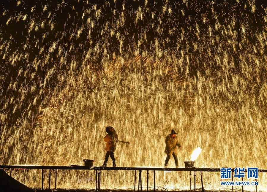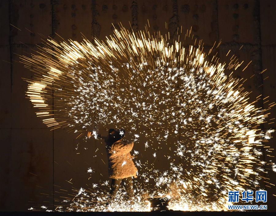 2月17日晚,民间艺人在进行“打树花”民俗表演。 当晚,河北唐山遵化市团瓢庄乡山里各庄村花灯广场举行“打树花迎元宵”民俗表演,欢庆佳节。 新华社发(刘满仓 摄)