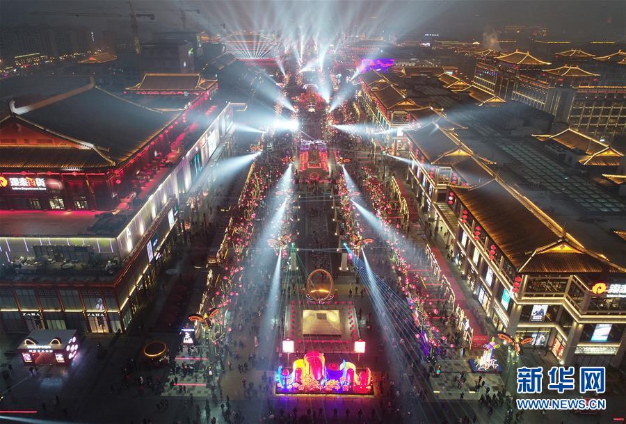 这是2月17日拍摄的西安市曲江新区大唐不夜城步行街夜景(无人机拍摄)。 春节假期过后,陕西西安旅游市场持续繁荣,部分景区依旧游人如织。 新华社记者 邵瑞 摄