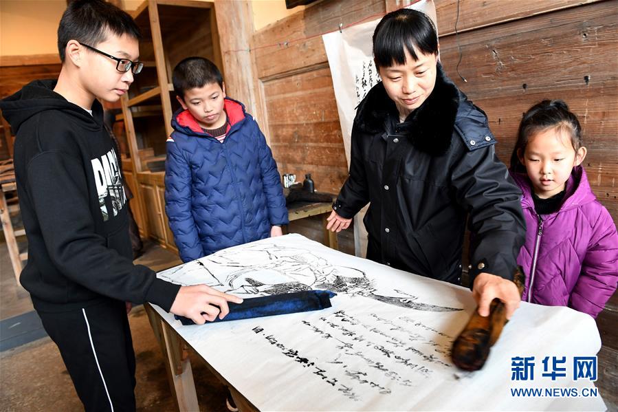 2月17日,在四堡镇雾阁村,几名学生在修缮完毕的“定敷公祠”体验雕版印刷工艺。 福建省连城县四堡镇雕版印刷业始于宋、盛于明清,现存明清书坊古建筑54座。近年来,连城县对四堡明清书坊建筑进行修葺,目前已有七座古建筑完成修葺。 新华社记者 彭张青 摄
