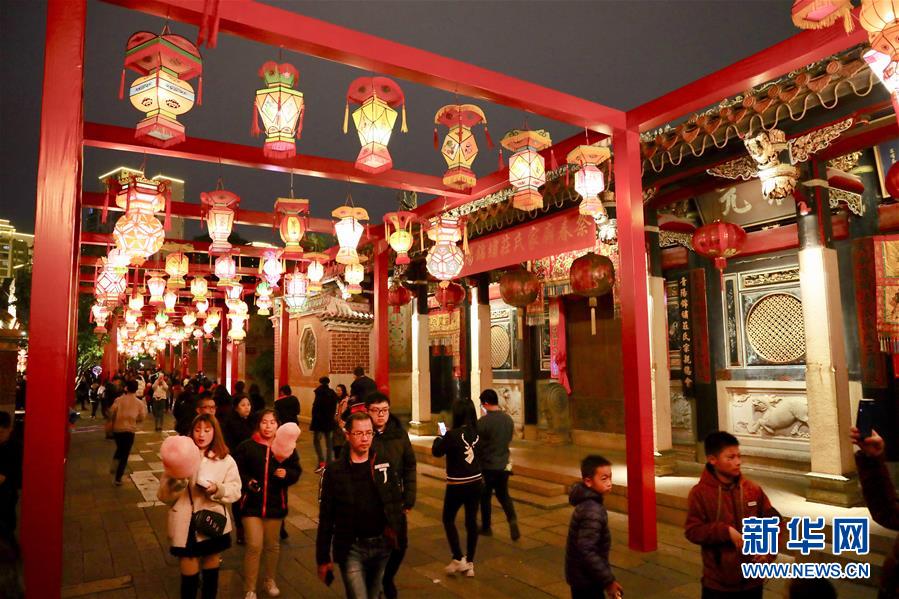 2月17日,市民在晋江五店市传统街区内观赏花灯。元宵佳节临近,福建省晋江市按照“全城赏灯,多点纷呈”的布灯形式,把全市3000多盏传统工艺花灯、学生手工制作花灯、大型座灯分布于五店市传统街区、世纪公园及安海镇安平桥公园三大花灯展示区域,方便市民就近赏灯。 新华社记者 姜克红 摄