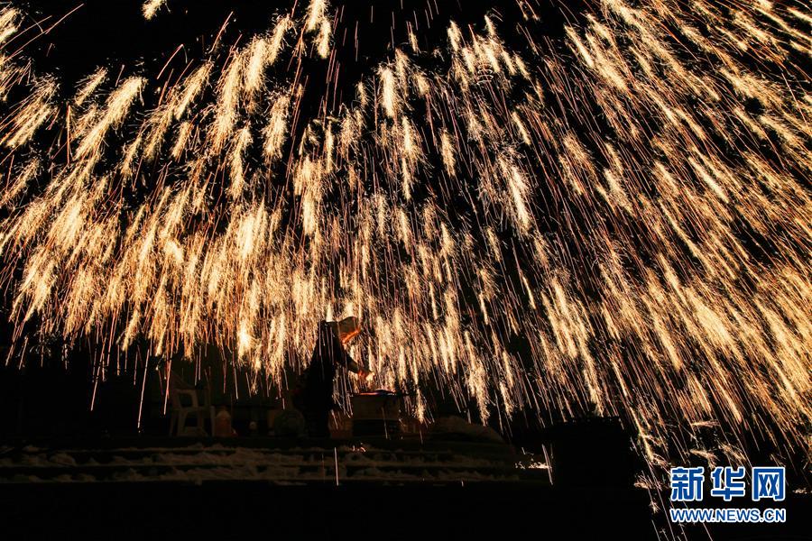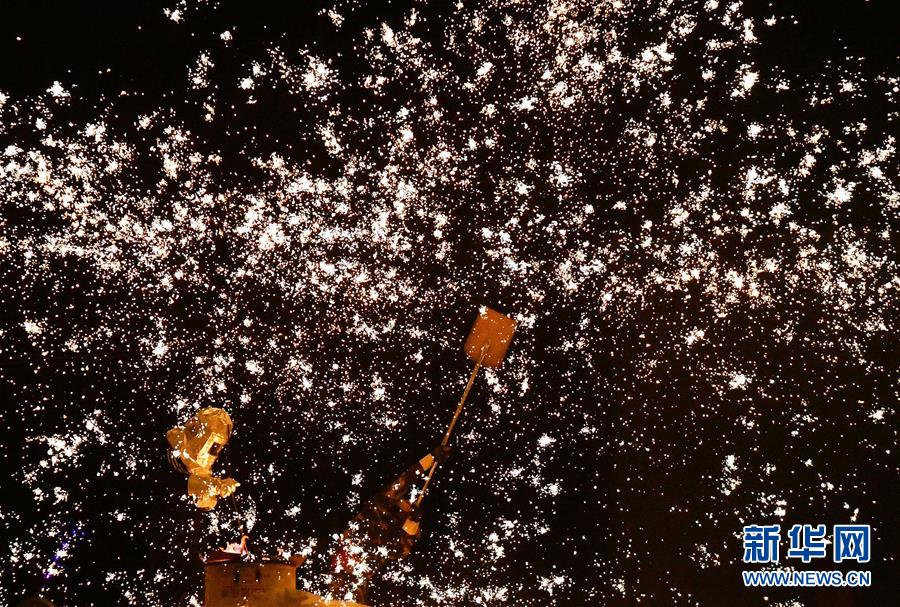 2月17日,民间艺人在山东烟台塔山景区表演“打铁花”。元宵节临近,各地举办丰富多彩的民俗活动,欢欢喜喜迎佳节。 新华社发(唐克 摄)