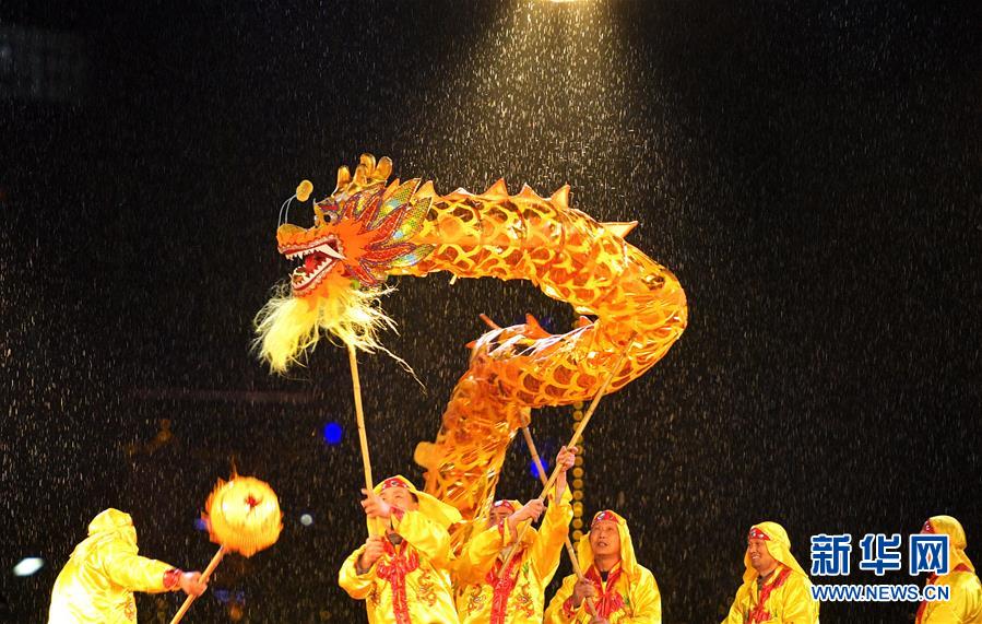 2月17日,在湖北省宣恩县人民广场,民间艺人在雪中表演舞龙。元宵节临近,各地举办丰富多彩的民俗活动,欢欢喜喜迎佳节。 新华社发(宋文 摄)