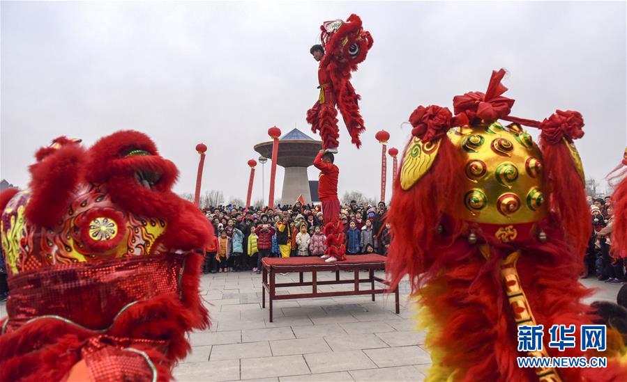 这是河北省阜城县花会展演上的舞狮表演(2月18日摄)。 2月18日,河北省阜城县元宵花会展演拉开帷幕,秧歌、舞龙、舞狮等展演节目增添了节日的喜庆气氛,给全县人民送上“文化大餐”。 新华社记者李晓果摄