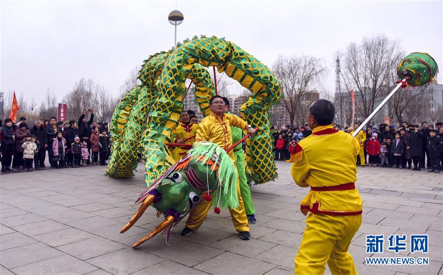 这是河北省阜城县花会展演上的舞龙表演(2月18日摄)。 2月18日,河北省阜城县元宵花会展演拉开帷幕,秧歌、舞龙、舞狮等展演节目增添了节日的喜庆气氛,给全县人民送上“文化大餐”。 新华社记者李晓果摄