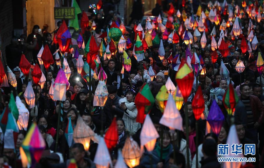 2月18日,群众在四川省南充市嘉陵区金宝镇点亮“蛴蟆灯”。 当日是农历正月十四,夜幕降临后,川渝等地数万名群众在四川省南充市嘉陵区金宝镇汇聚,点亮“蛴蟆灯”,敲着锣鼓唱着歌谣,将“蛴蟆”送到几公里外的田边或者河边烧掉,祈福健康平安。星星点点的灯光在乡间小路闪烁移动,场面壮观热烈。 “送蛴蟆”祈福这一习俗源于清朝,历经演变成为川东北地区一个古老而神秘的地方民俗节日。 新华社记者 江宏景 摄