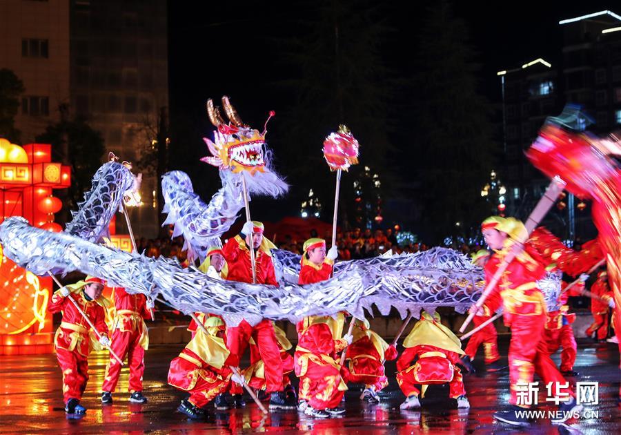 2月17日,民间艺人在贵州省铜仁市玉屏侗族自治县舞阳广场表演舞龙。 元宵节临近,各地举办丰富多彩的民俗活动,欢欢喜喜迎佳节。 新华社发(胡攀学 摄)