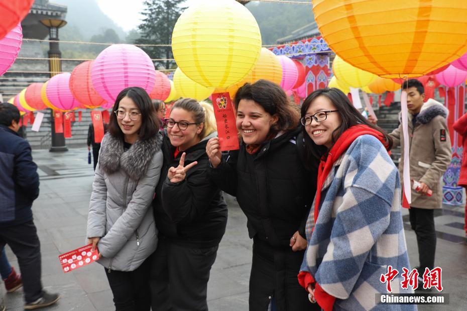 2月19日,海内外游客在灯谜区合影留念。当日,正值正月十五,在贵州贵阳孔学堂春节文化庙会“我们的节日?元宵”活动中,各式各样的表演、体验项目吸引了众多民众前去参与,热闹过元宵。中新社记者 瞿宏伦 摄