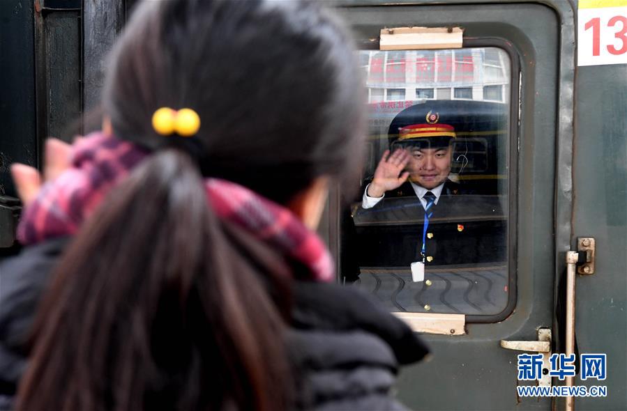 2月19日,在郑州火车站站台上,朱康瑜在发车前和妻子刘晓婧隔着车门挥手道别。 当日10时50分许,K4364次列车在郑州火车站4站台始发停靠,怀孕6个多月的刘晓婧在母亲的搀扶下走向13号车厢,列车临时乘务员朱康瑜迎向了妻子。“媳妇儿,让我听听宝宝的‘声音’。”朱康瑜单膝跪地,把耳朵贴在妻子的肚子上。元宵节,本是团圆的日子,他们却只能在站台上短暂相聚。 为应对春运客流高峰,中国铁路郑州局集团有限公司从非运输一线单位抽调了大量临时乘务员,在郑州工务机械段劳动人事科任干事的朱康瑜便是其中一员;同样是该段职工的刘晓婧在轨料运输车间任职,虽然怀有身孕,但为了保证郑(州)万(州)高铁建设用轨需要,春节期间仍加班加点工作。一来二去,两人已经半个多月没有见面。 元宵节当天,原本休息的夫妻俩约好了一起去医院做产前检查,可是朱康瑜接到了值乘计划临时调整通知,需要到下一趟车组继续值班,再一次错过了团聚的机会。 想到朱康瑜连续值乘,心疼丈夫的刘晓婧上午做完产检后,专程赶回家做了一碗汤圆,赶来车站送到丈夫手上。“亲爱的,安心工作,我和宝宝等你回家。”刘晓婧在即将发车前对丈夫说。 新华社记者李安摄