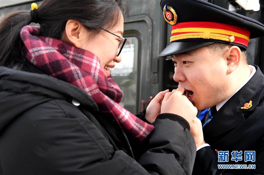2月19日,在郑州火车站站台上,朱康瑜为怀孕的妻子刘晓婧暖手。 当日10时50分许,K4364次列车在郑州火车站4站台始发停靠,怀孕6个多月的刘晓婧在母亲的搀扶下走向13号车厢,列车临时乘务员朱康瑜迎向了妻子。“媳妇儿,让我听听宝宝的‘声音’。”朱康瑜单膝跪地,把耳朵贴在妻子的肚子上。元宵节,本是团圆的日子,他们却只能在站台上短暂相聚。 为应对春运客流高峰,中国铁路郑州局集团有限公司从非运输一线单位抽调了大量临时乘务员,在郑州工务机械段劳动人事科任干事的朱康瑜便是其中一员;同样是该段职工的刘晓婧在轨料运输车间任职,虽然怀有身孕,但为了保证郑(州)万(州)高铁建设用轨需要,春节期间仍加班加点工作。一来二去,两人已经半个多月没有见面。 元宵节当天,原本休息的夫妻俩约好了一起去医院做产前检查,可是朱康瑜接到了值乘计划临时调整通知,需要到下一趟车组继续值班,再一次错过了团聚的机会。 想到朱康瑜连续值乘,心疼丈夫的刘晓婧上午做完产检后,专程赶回家做了一碗汤圆,赶来车站送到丈夫手上。“亲爱的,安心工作,我和宝宝等你回家。”刘晓婧在即将发车前对丈夫说。 新华社记者李安摄