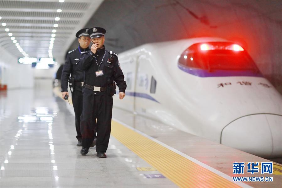 2月19日,警长曾仁仲(前)和民警叶波在站内巡查。 成都铁路公安局贵阳铁路公安处贵阳东车站派出所龙洞堡警务区,位于贵阳龙洞堡机场航站楼西侧广场地下负二层的龙洞堡高铁站内。春运期间,警长曾仁仲和民警叶波坚守在地下49米的岗位上,确保着春运安全。 新华社记者欧东衢摄
