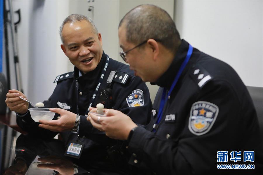 2月19日,警长曾仁仲(左)和民警叶波在值班室内吃汤圆庆祝元宵节。 成都铁路公安局贵阳铁路公安处贵阳东车站派出所龙洞堡警务区,位于贵阳龙洞堡机场航站楼西侧广场地下负二层的龙洞堡高铁站内。春运期间,警长曾仁仲和民警叶波坚守在地下49米的岗位上,确保着春运安全。 新华社记者欧东衢摄