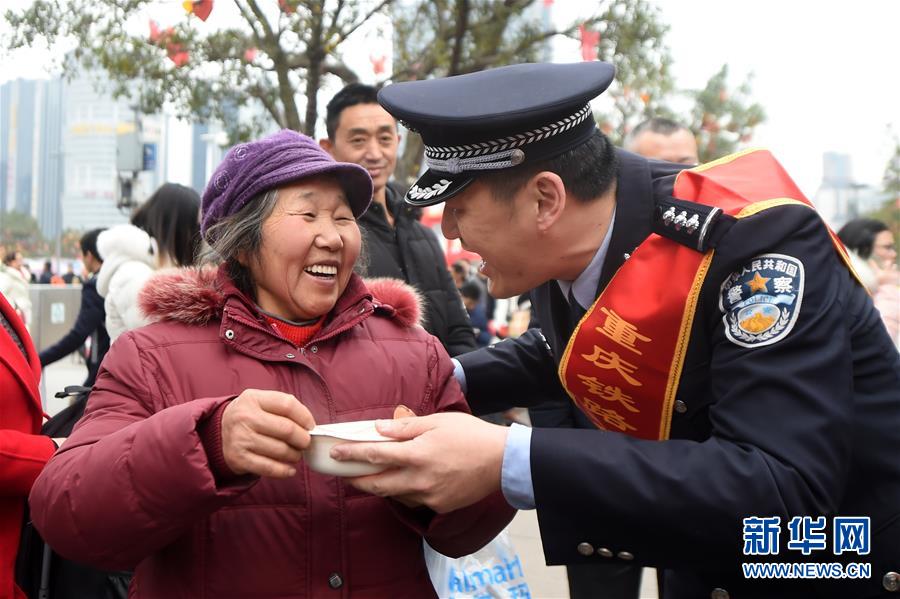 2月19日,铁路公安民警向旅客赠送汤圆送祝福。 新华社记者 唐奕 摄