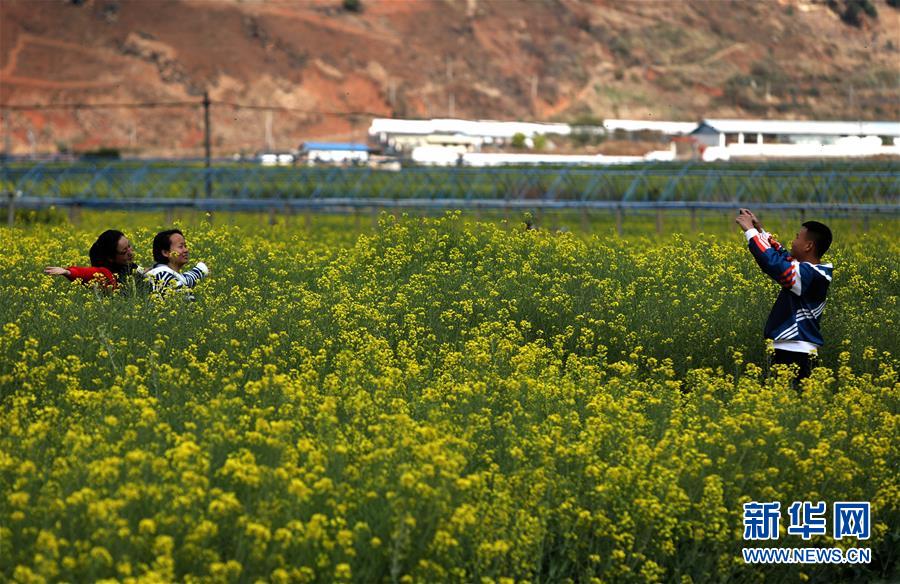 2月19日,在四川省攀枝花市米易县普威镇,游客在油菜花田内拍照。