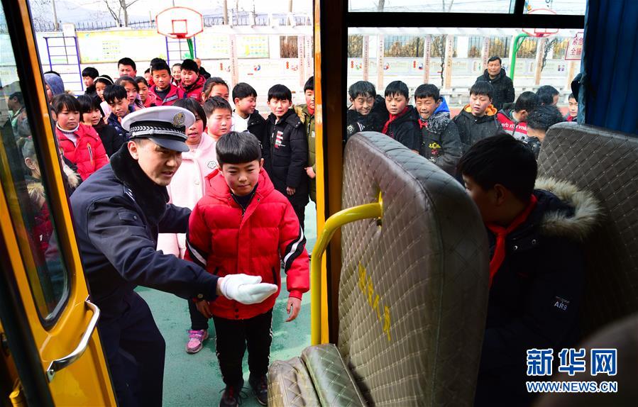 2月20日,在山东省枣庄市山亭区兴国希望小学,山亭区交警大队民警王传安在开学第一课上指导学生安全乘坐校车。 新华社发(刘明祥 摄)