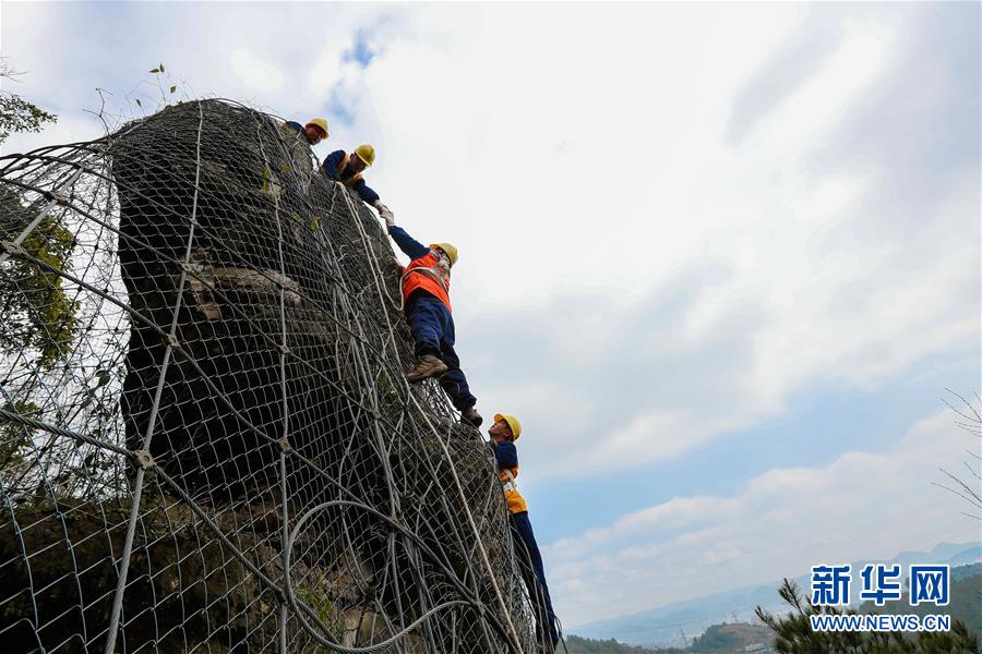 2月21日,贵阳高铁工务段工作人员在沪昆高铁一处隧道上方处理危石。新华社记者 刘续 摄