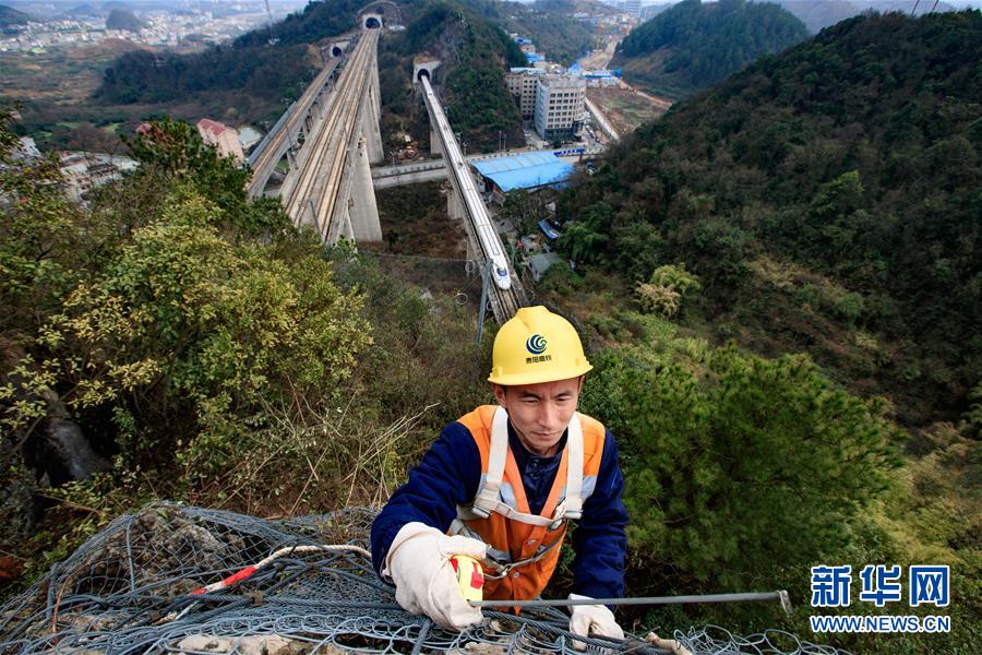 2月21日,贵阳高铁工务段工作人员在沪昆高铁一处隧道上方处理危石。新华社记者 刘续 摄