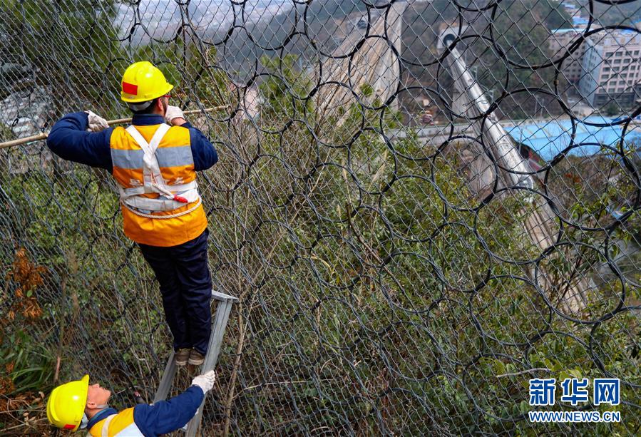 2月21日,贵阳高铁工务段工作人员在沪昆高铁一处隧道上方清除防护网上的藤蔓。新华社记者 刘续 摄